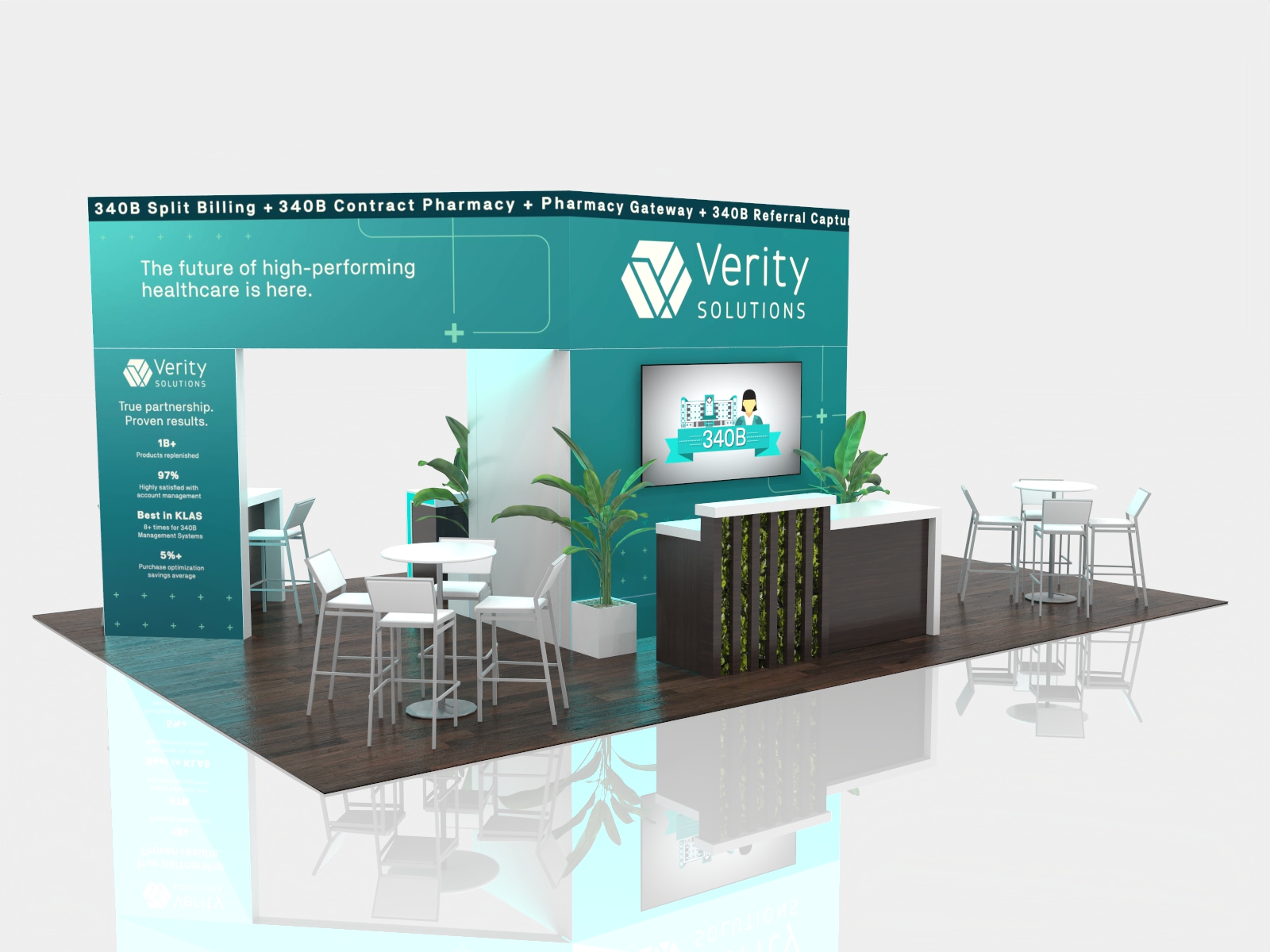 Bold backlit graphics with practical accessories are the hottest trend in island designs. The VK-5214 and VK-5215 strike a balance with backlit graphics, reception and demo counters, and casual seating. The SuperNova lightboxes are double-sided for maximum exposure and engineered for large monitors. The reception counter includes LED accent lights and storage. Along the four corners, there are demo stations and casual table seating. There's even a fun coffee bar to encourage attendees to stop, chat, and linger.