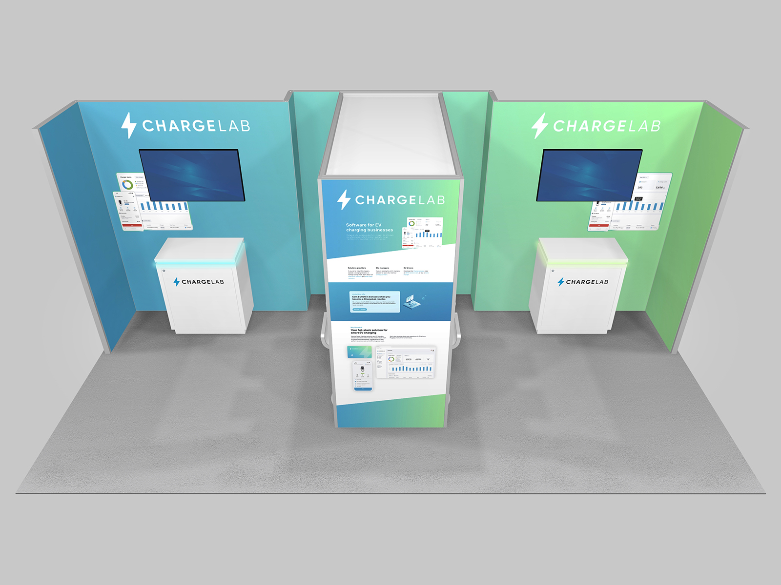 The best trade show exhibits combine style and strategy into a cohesive design. The RE-2159, 2160, and 2161 are perfect examples of that. They blend large format fabric graphics with selective backlighting into a 10 x 20 with attractive counters, monitors, and casual seating.