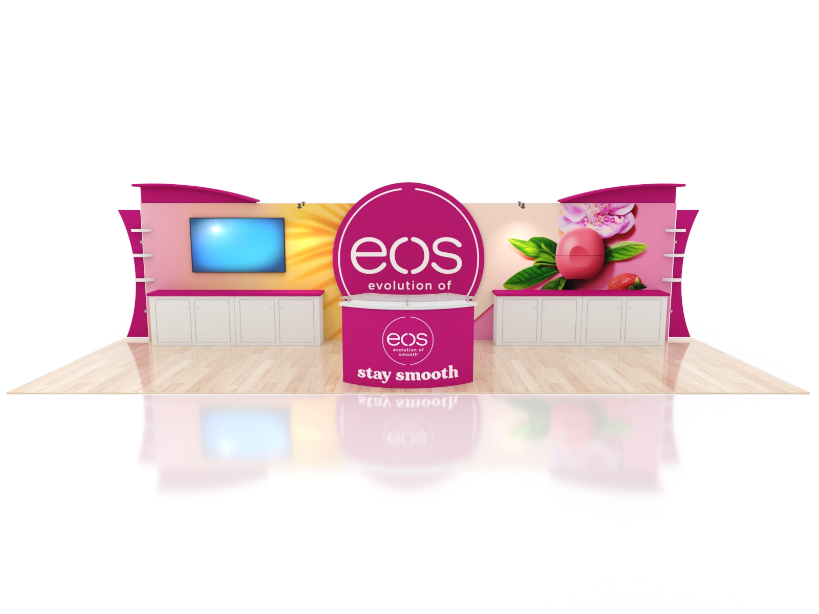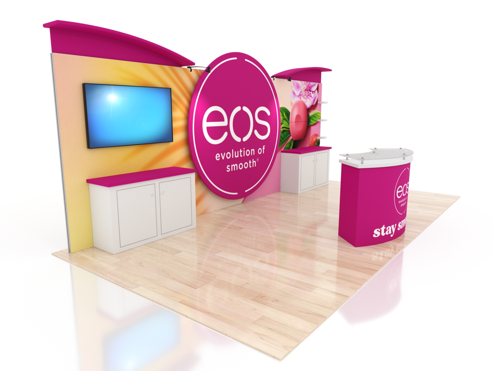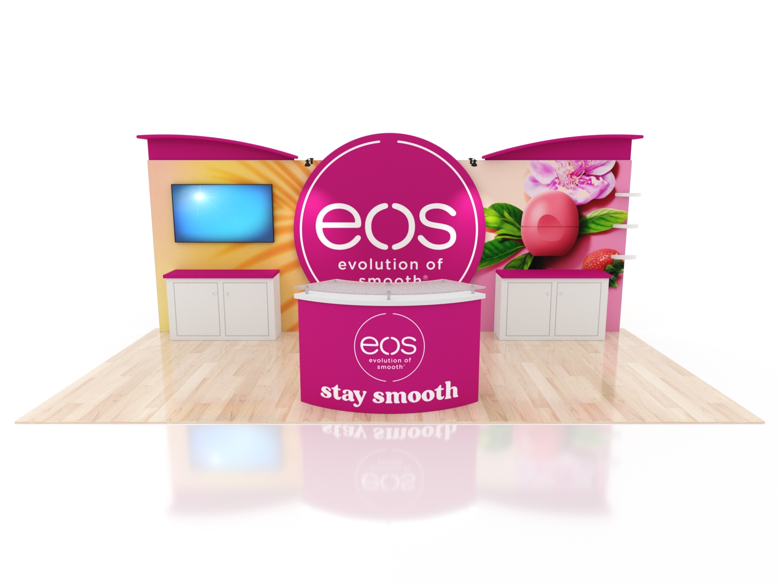 These designs come with ample storage in cabinets on the backwall and in the curved reception counter. Add vinyl graphics to both for more branding. The entire display packs in a fabric-lined, fully jigged custom crate. Each component is numbered for effortless assembly.