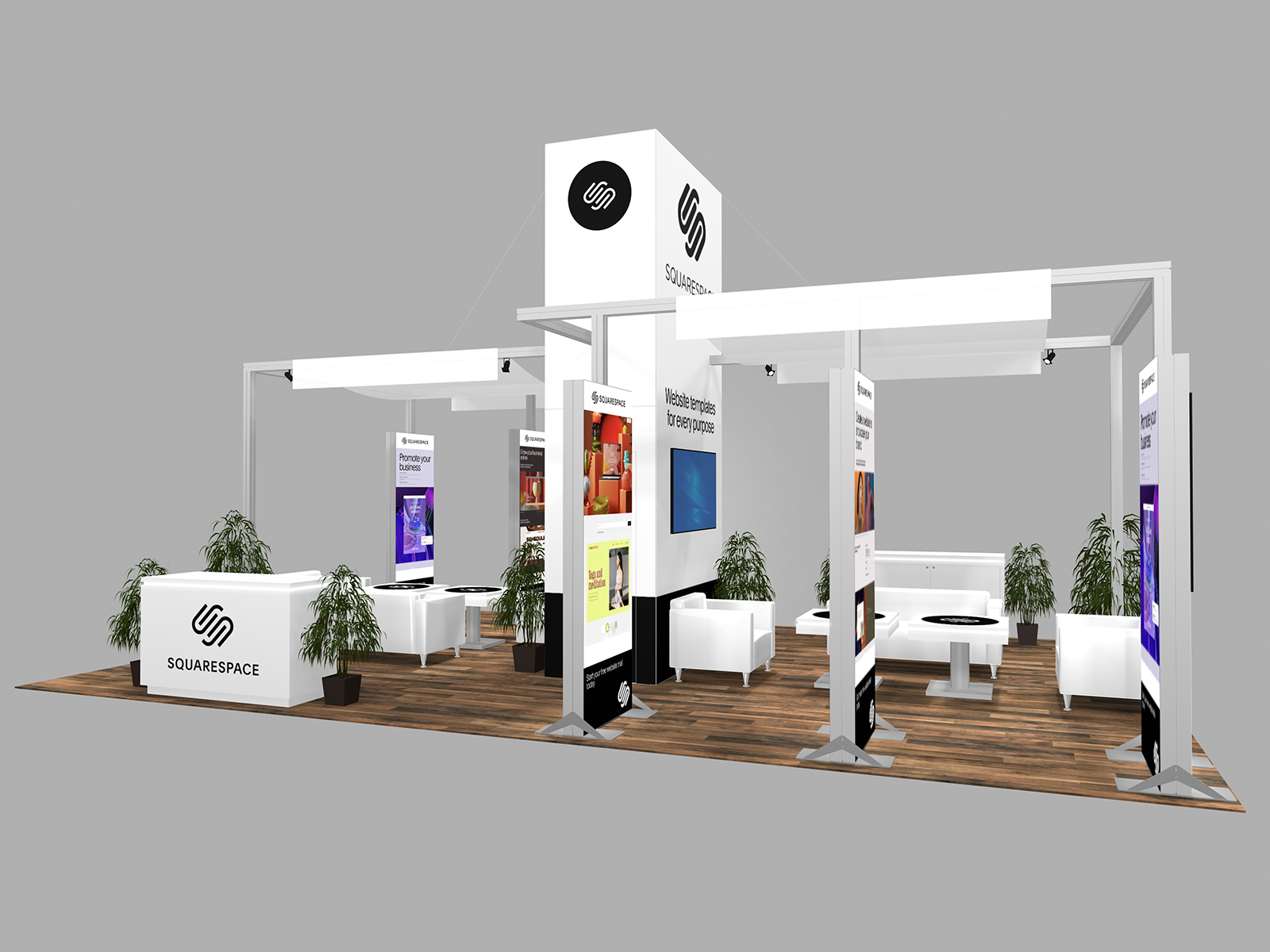 Comfortable and productive are rarely used together to describe a trade show exhibit design. Yet, the VK-5216, VK-5218 and VK-5218 series of 20 x 30 islands are perfect examples of how design can blend these two concepts into a stylish booth. They feature large format fabric graphics with backlighting, demo stations, and multiple monitors, The VK-5216 and VK-5217 have ceiling canopies with scrim fabric, whereas the VK-5218 has a rectangle hanging sign for increased visibility.