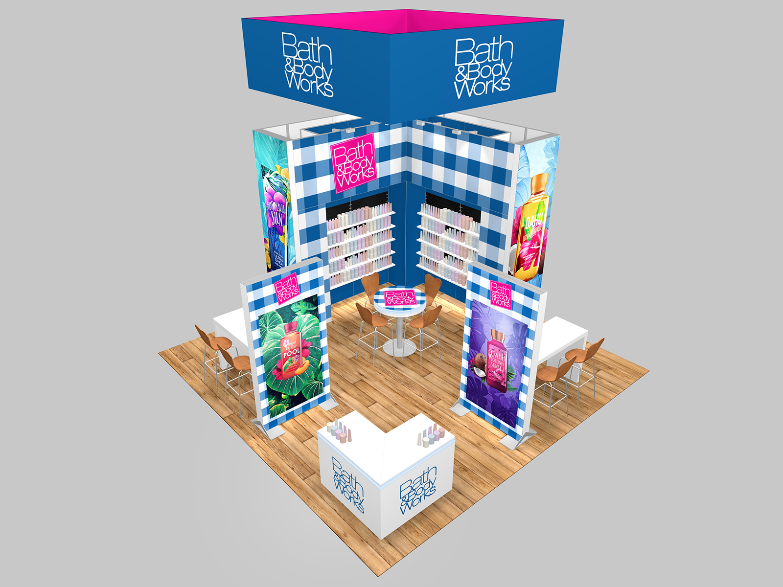 Visually, the design has (2) single-sided LED lightboxes and (2) double-sided lightboxes and large format fabric graphics along the back and front of the tower. For maximum visibility in the show halls, there’s a large square hanging sign with a graphic ceiling. The reception counter has LED accent lights and locking storage.